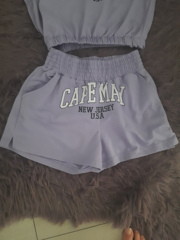 Gri pamuklu mini şort, bel bantlı ve üzerinde "CAPEMAY NEW JERSEY U.S.A" baskısı bulunur. Spor ve rahat sokak stili için uygundur.