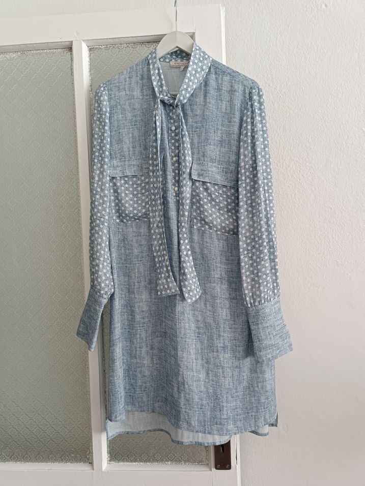 Yumuşak şifon kumaştan, bol kesim, uzun kollu, düğmeli ve mavi puantiye desenli bohem tunik. etrucci marka çok şık tunik.