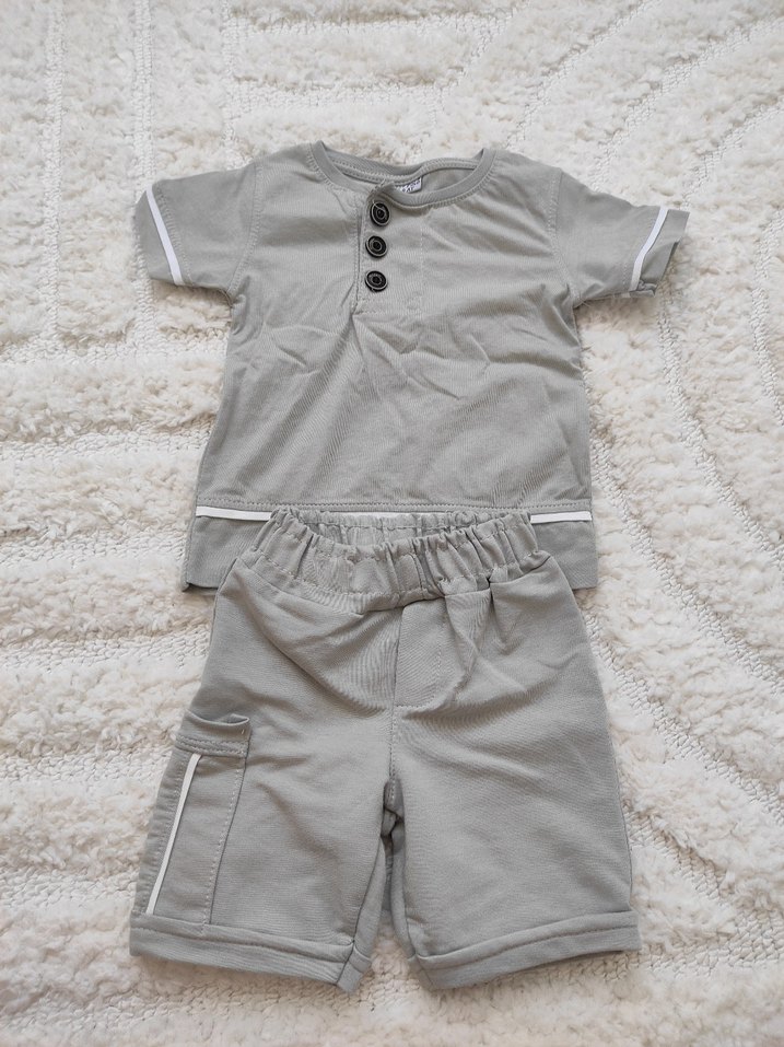 Gri renk, kısa kollu, düğmeli ve bisiklet yaka pamuklu üst ile elastik bel lastikli şorttan oluşan bebek erkek takımı.