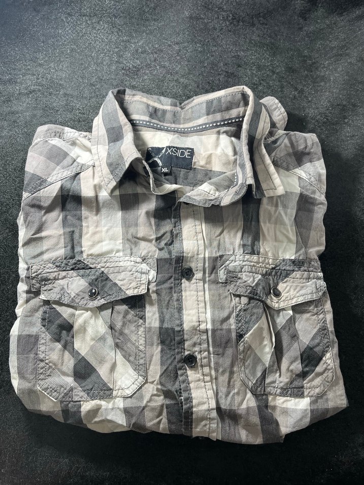 Gri pamuklu gömlek, düğmeli, kısa kollu ve yakalıdır. Salaş kesimi ve sade deseniyle günlük kullanıma uygundur.