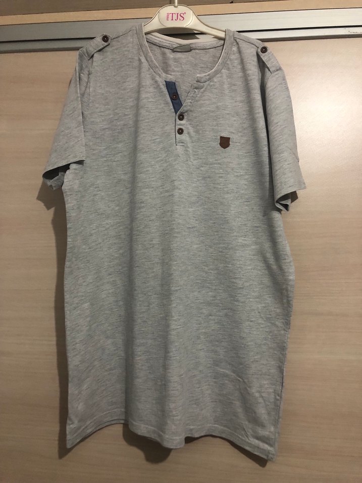Gri pamuklu, kısa kollu, yuvarlak yaka ve düğme detaylı bol kesim tişört. Günlük sokak stili için uygundur.