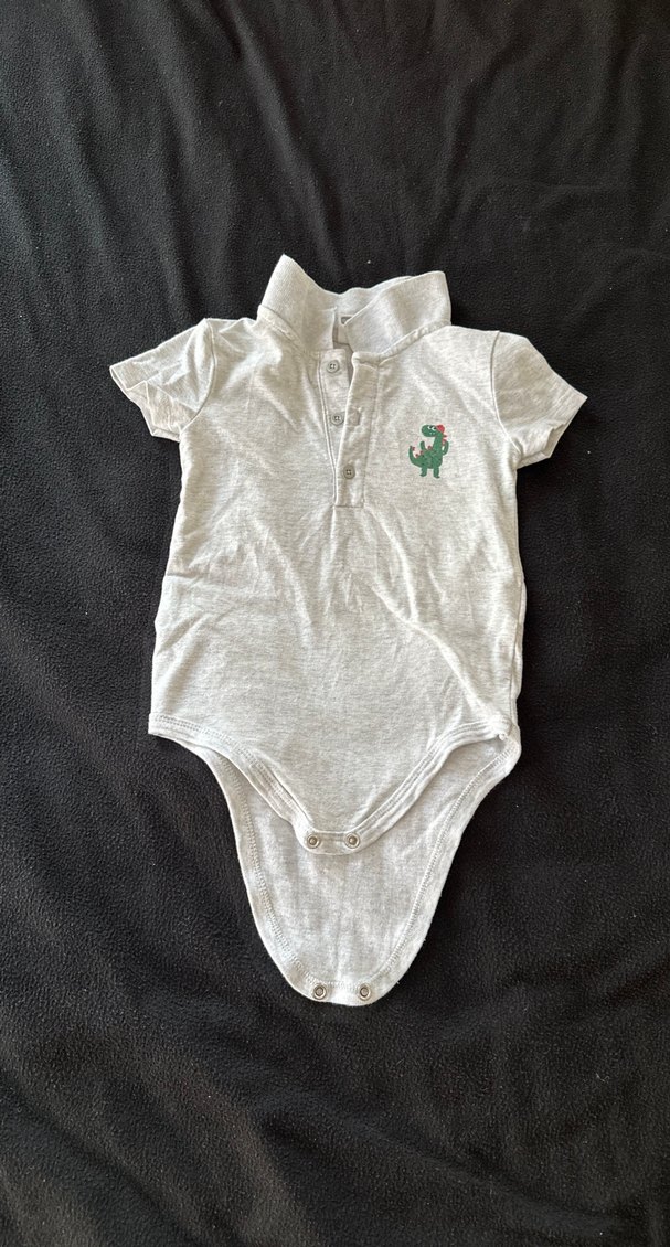 2-3 yaş. Gri pamuklu erkek bebek body, kısa kollu ve yakalıdır. Düğmeli ve küçük dinozor baskılıdır. Streetwear tarzında.