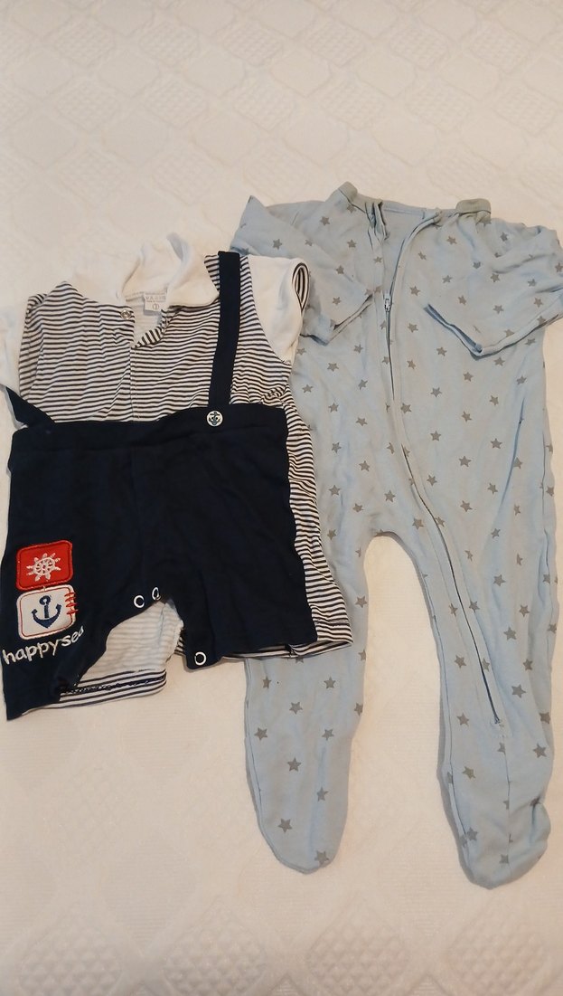 Gri yıldız desenli pamuklu tulum ve lacivert askılı, çıtçıtlı çizgili tulumdan oluşan erkek bebek kıyafet seti.