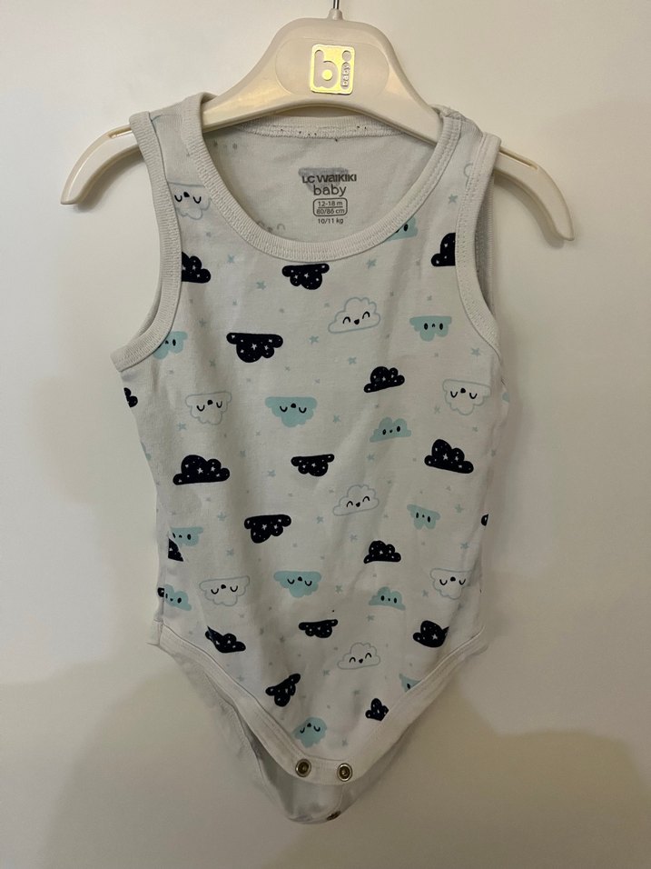 Gri pamuklu kolsuz erkek bebek body, bisiklet yaka ve bulut desenleriyle sokak stili ve rahat şıklık sunar. ☁️