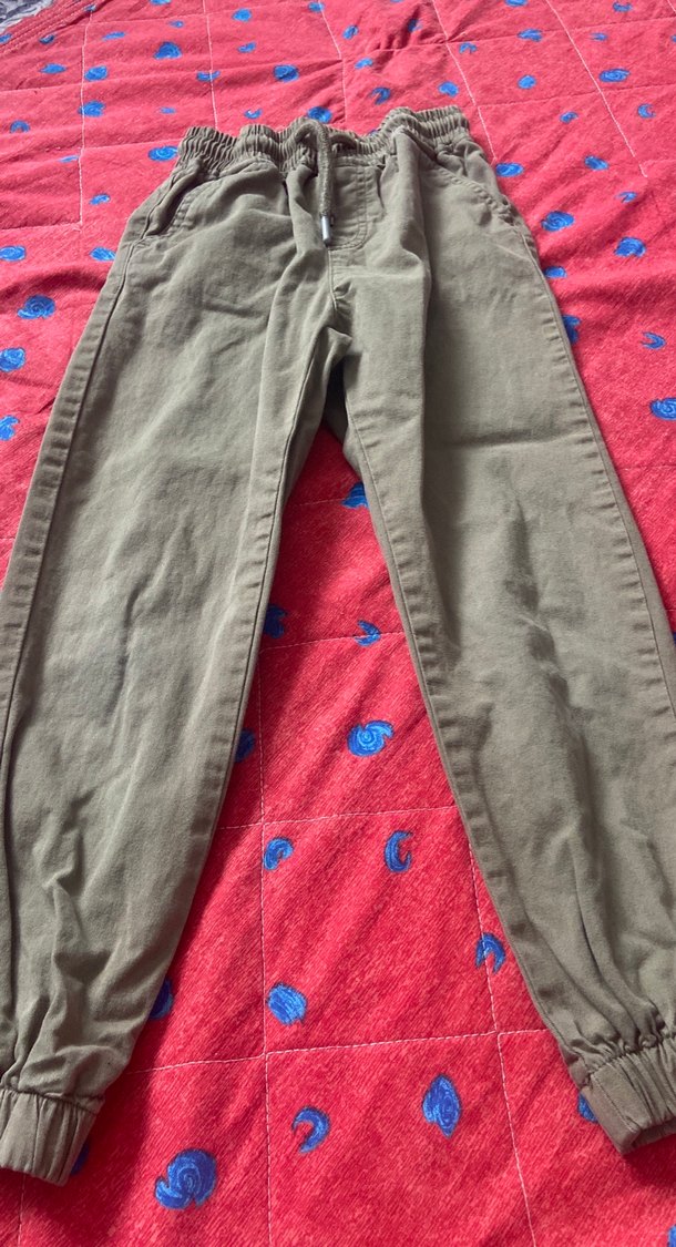 Gri pamuklu kumaştan yapılmış, düğmeli ve rahat kesim erkek çocuk pantolonu. Sokak tarzı için uygun, desensiz ve konforlu.