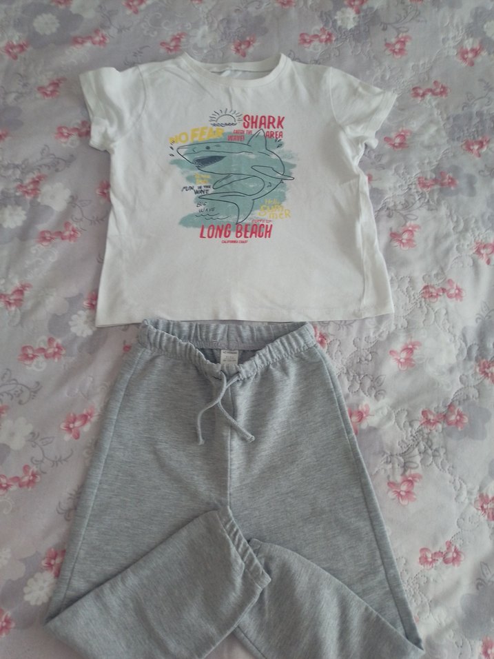 Pamuklu, kısa kollu, baskılı tişört ve rahat gri pantolondan oluşan ikili takım.Gri alt olanda hafif bir sökük var resimlerde belirttim belli olmuyor uygun tutacagim.ust koton marka