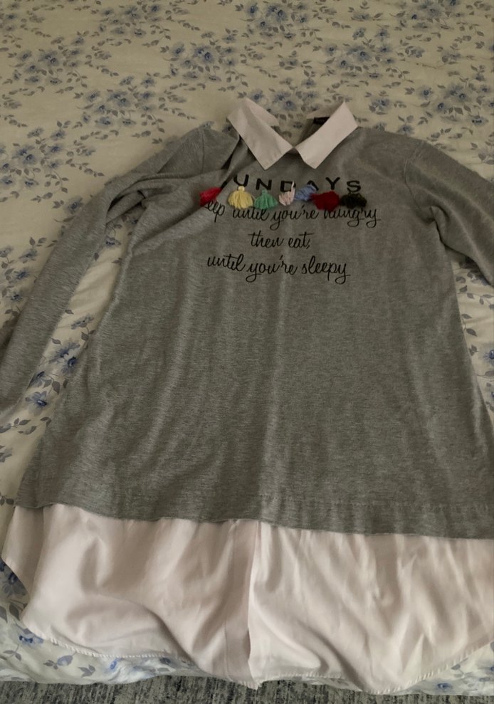 Gri pamuklu gömleği, yakalı ve uzun kolludur. Baskılı ve düğmeli detaylarla rahat ve salaş bir görünüm sunar.