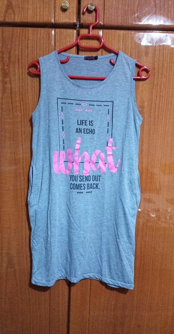Gri pamuklu, kolsuz hamile midi elbise. Yuvarlak yaka, bol kesim, üzerinde pembe-siyah baskılı motivasyon sözü bulunur. Günlük kullanıma uygun rahat model.