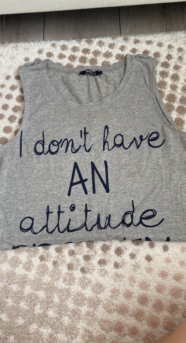 Gri pamuklu, kolsuz kadın atlet, yuvarlak yaka ve fırfır detaylı. Rahat kesimli ve üzerinde 'I don't have AN attitude' yazısı baskılı. Günlük kullanım için uygun.