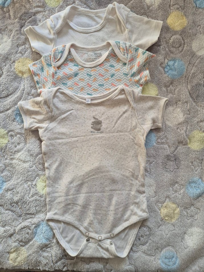Bu set, gri ve desenli tasarımlarda kısa kollu, yuvarlak yakalı pamuklu örgü bebek body'lerinden oluşur. Rahat ve yumuşak dokuda.