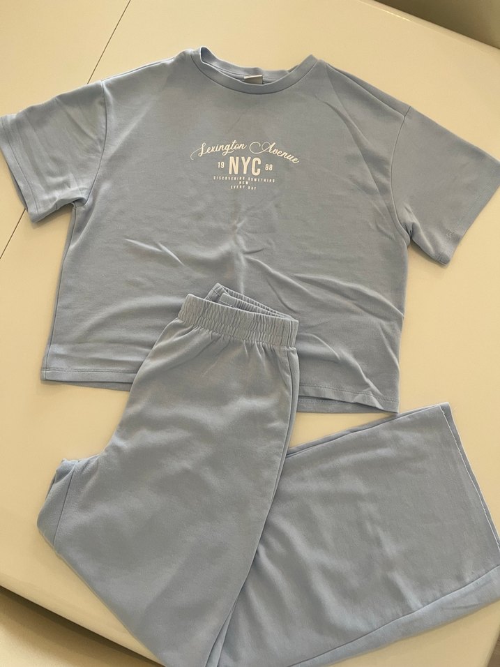 Gri pamuklu, kısa kollu ve oversize kesim eşofman takımı, önünde "NYC" baskısı ile rahat ve şık görünüyor.