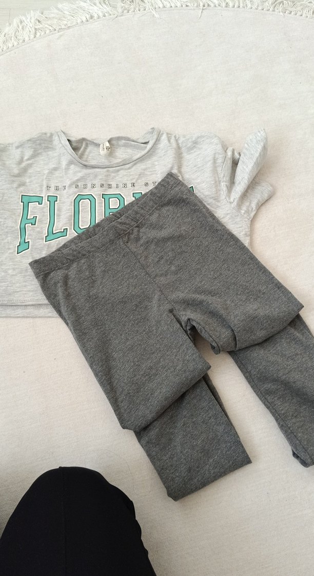 Pamuklu, gri renkli, bol kesim tayt ve kısa kollu, baskılı tişört ile rahat ve şık bir kombin sunar.