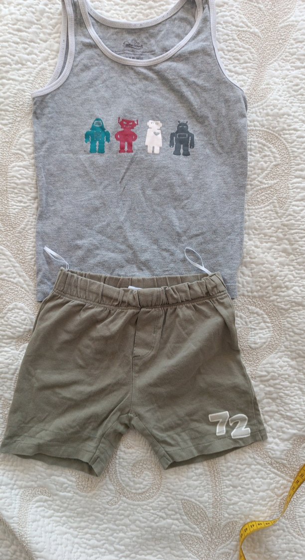 Pamuklu, kolsuz gri üstü renkli robot desenli ve elastik bel detaylı haki şortlu bebek takımı. İkisi de temiz sorunsuz