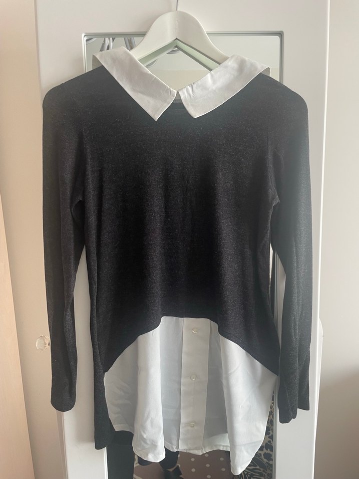 Gri pamuklu örgü kazak, yakalı ve uzun kolludur. Salaş kesimi ve beyaz gömlek detaylı katmanlı görünümüyle gotik ve Paris tarzını birleştirir. Günlük kullanıma uygundur.