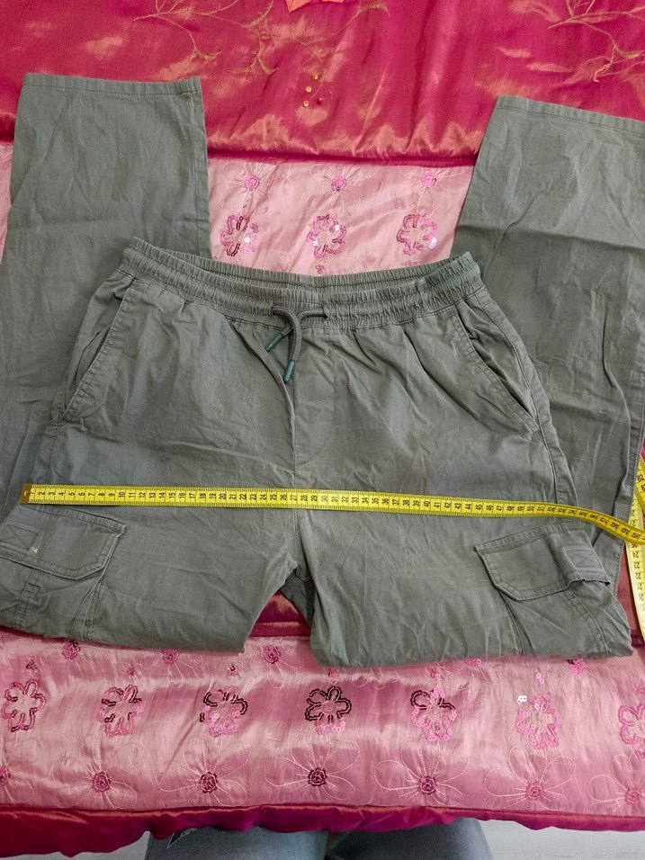 şu yeşili pamuklu kumaştan, lastikler kemerli ve normal kesim ve uzun unısexs pantolon. Yan cepleri ve rahat lastikli beli ile dış mekan kullanımı için uygundur.