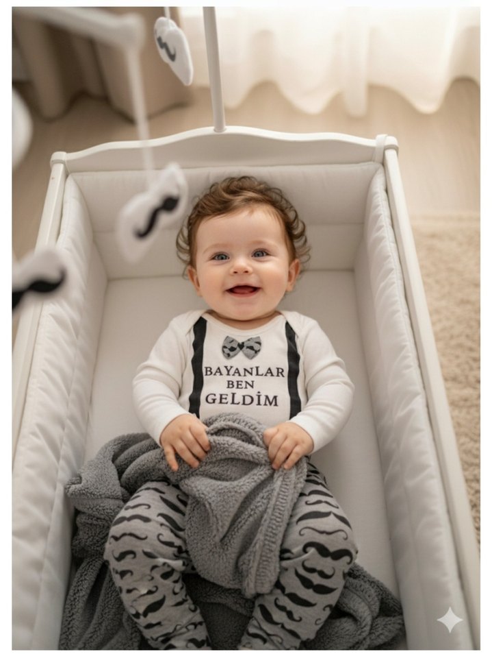 Gri renkte, pamuklu kumaştan uzun kollu bebek body. Halter yaka ve baskılı yazı detayları ile konforlu ve şık.