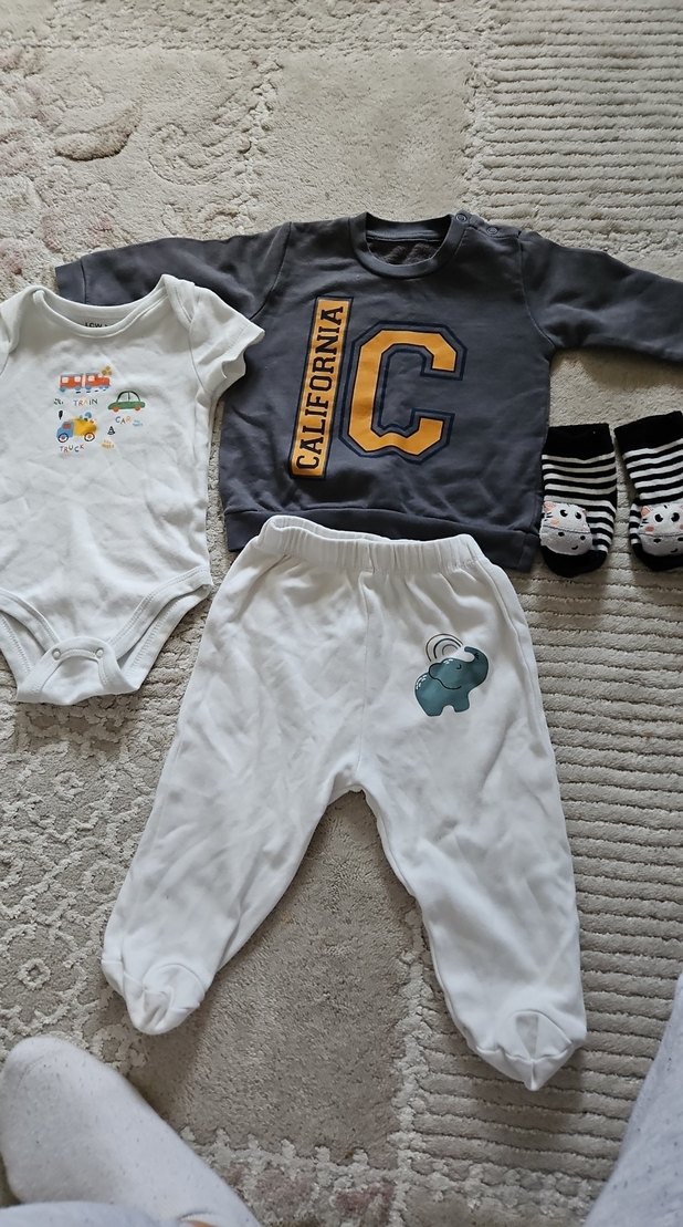 Gri uzun kollu, bisiklet yakalı üst, beyaz pamuklu fil detaylı pantolon, araç baskılı kısa kollu zıbın ve çizgili hayvan figürlü çoraplardan oluşan bebek takımı. Rahat ve yumuşak kumaşlıdır.
