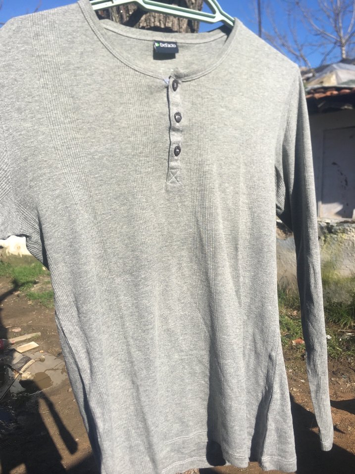 Gri renkli, pamuklu kumaştan yapılmış uzun kollu erkek tişörtü. Yuvarlak yaka ve düğmeli detaylara sahip, rahat ve normal boyda, günlük kullanıma uygun.