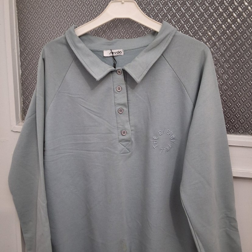 Gri pamuklu sweatshirt, düğmeli yakalı ve baskılı detaylıdır. Rahat kesimiyle günlük sokak tarzına uygundur.