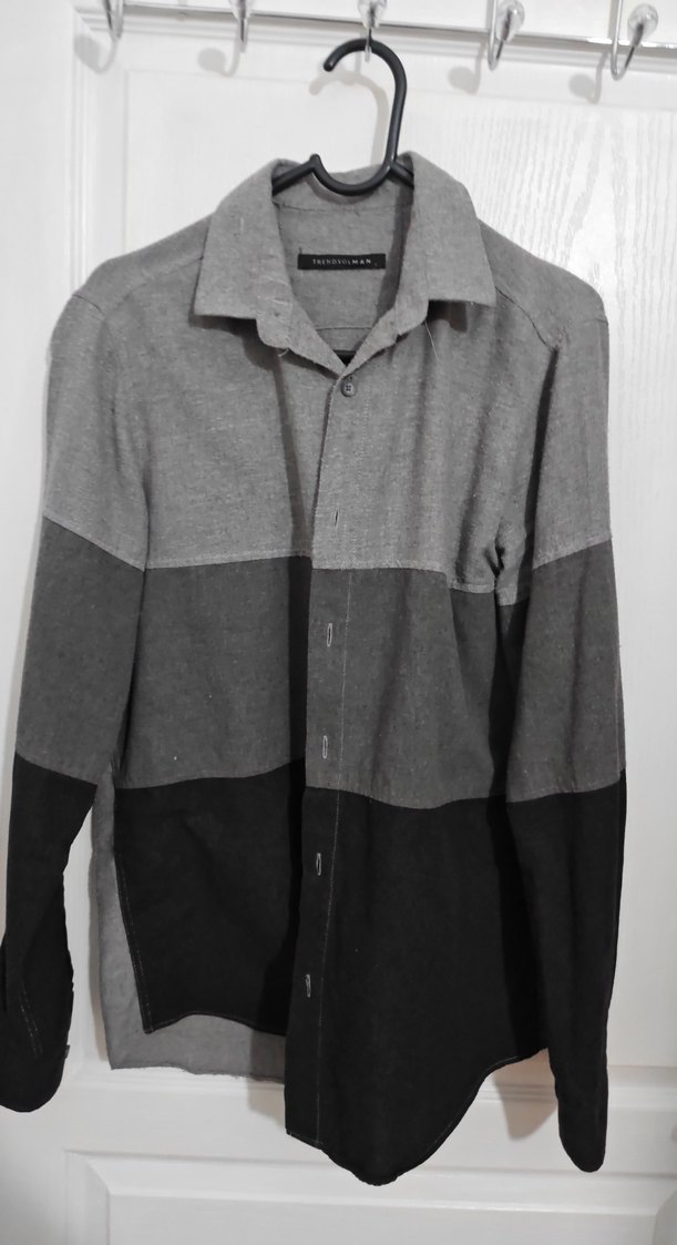 Pamuklu kumaştan üretilmiş, uzun kollu ve yakalı gri renk blok desenli erkek gömlek. Düğmeli, normal kesim ve günlük sokak stili için uygundur.
