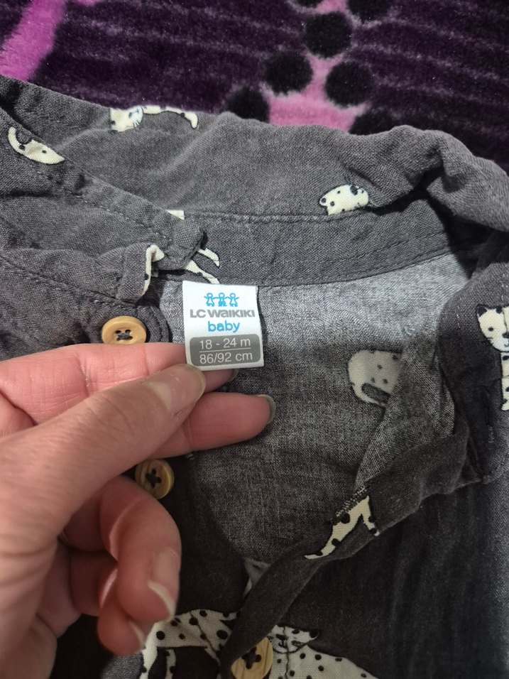 Gri pamuklu hamile gömleği, uzun kollu ve düğmeli. Bol kesim, baskılı desenli, notlu yaka ve normal midi boyda. Günlük kullanıma uygun. 18-24 ay, 86/92 cm.