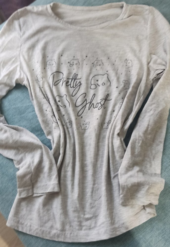 Yumuşak pamuktan, gri renkli, uzun kollu, bol kesim hamile tişörtü. Bisiklet yaka ve baskılı hayalet deseniyle rahat gotik tarz sunar. (dümdüz gecelik yaani)