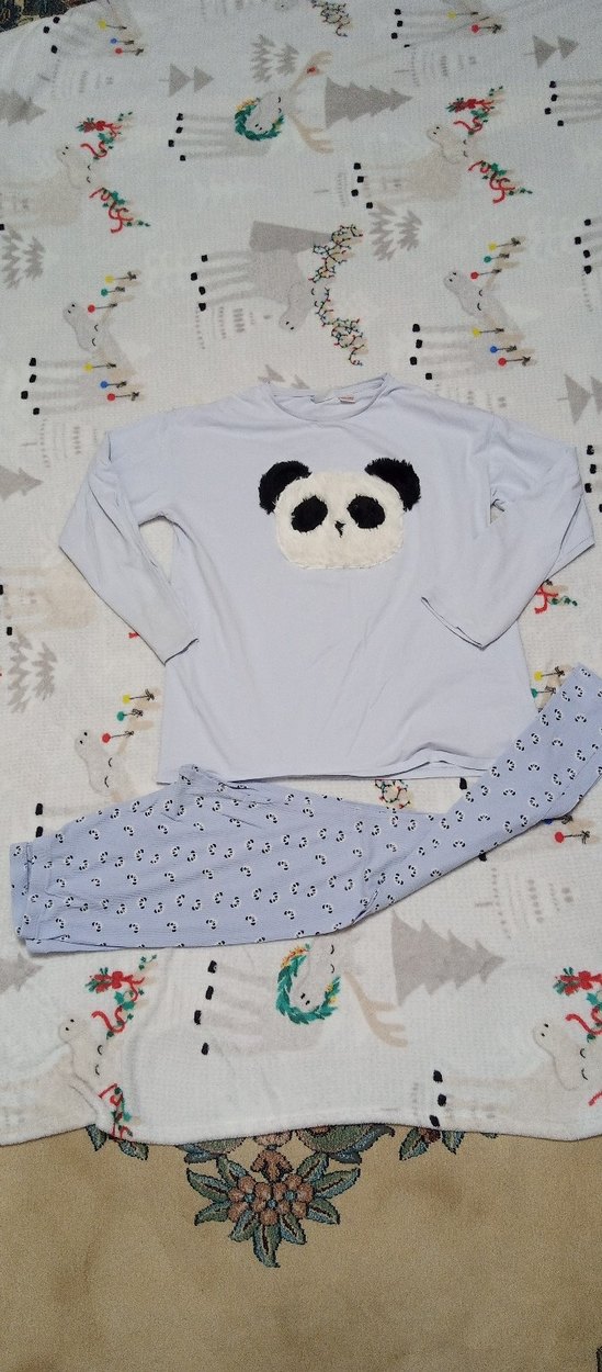 Gri renkli, uzun kollu, yuvarlak yakalı ve bol kesim çocuk pijama takımıdır. Üstte yumuşak panda yüzü baskısı, alt pantolonda küçük panda desenleri bulunur. Midi boyda rahat bir settir.
