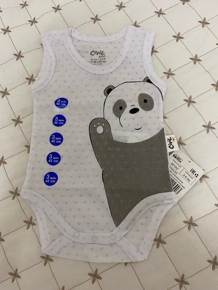 Gri pamuklu kumaştan, panda baskılı ve çıtçıtlı, kolsuz bebek body. Bisiklet yaka ve normcore tarzında.