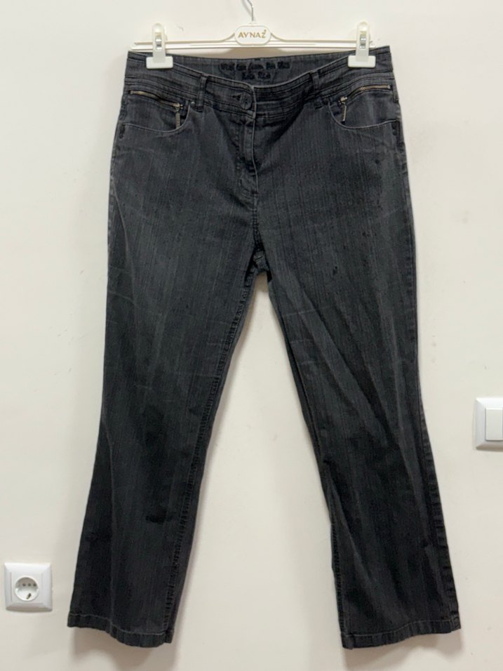 Gri renkli, rahat kesim ve normal boyda denim pantolon, günlük kullanıma uygun sade ve şık bir görünüme sahiptir. Desensiz tasarımıyla rahatlığı ön planda tutar.