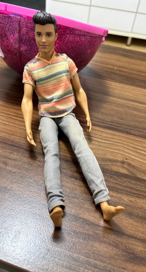 Çizgili kısa kollu gömlek ve gri pantolon giymiş erkek bebek oyuncak, ahşap yüzeyde oturuyor.
