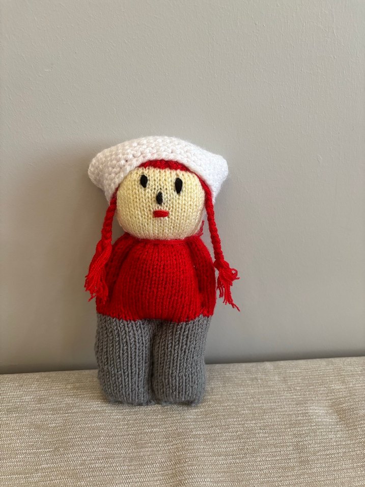 Gri pantolon, kırmızı üst ve beyaz şapkalı örgü bebek. Kırmızı örgülü saçları ve sade yüz ifadesi bulunur.