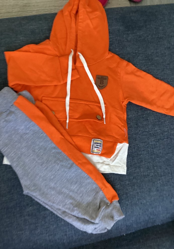 Turuncu kapüşonlu, düğmeli üst ile gri pantolondan oluşan bebek takımı. Yumuşak ve sıcak kumaştan, uzun kollu ve sokak tarzında.
