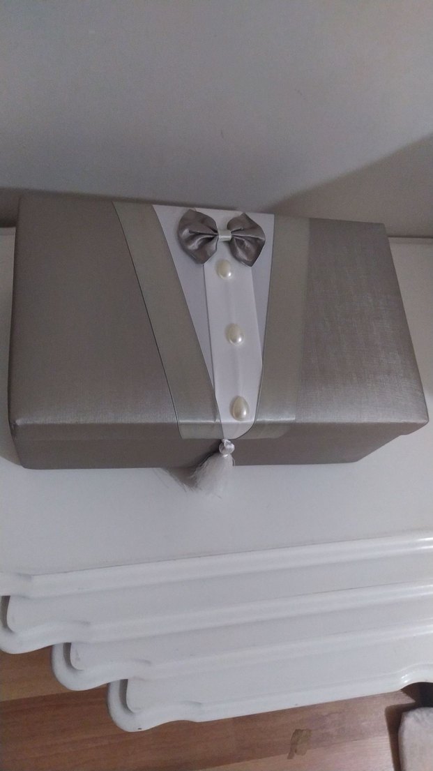 Gri papyon detayı ve inci düğmeleriyle minimalist ve aynalı modern görünümlü , çağdaş tarzda düğün için uygun tuxedo temalı kutu.