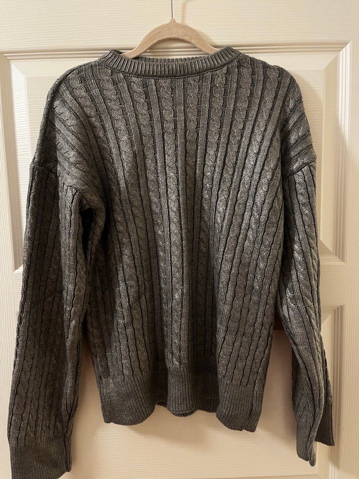 Gri renkli, örgü dokulu, yuvarlak yakalı ve uzun kollu kadın kazak. Rahat kesimi ve sade tasarımıyla günlük kullanıma uygundur. Geniş kesim. Çok az giyildi. Yeni gibi. Kusuru yok. Çok şık. Hafif parıltılı. S-M arası bir beden.