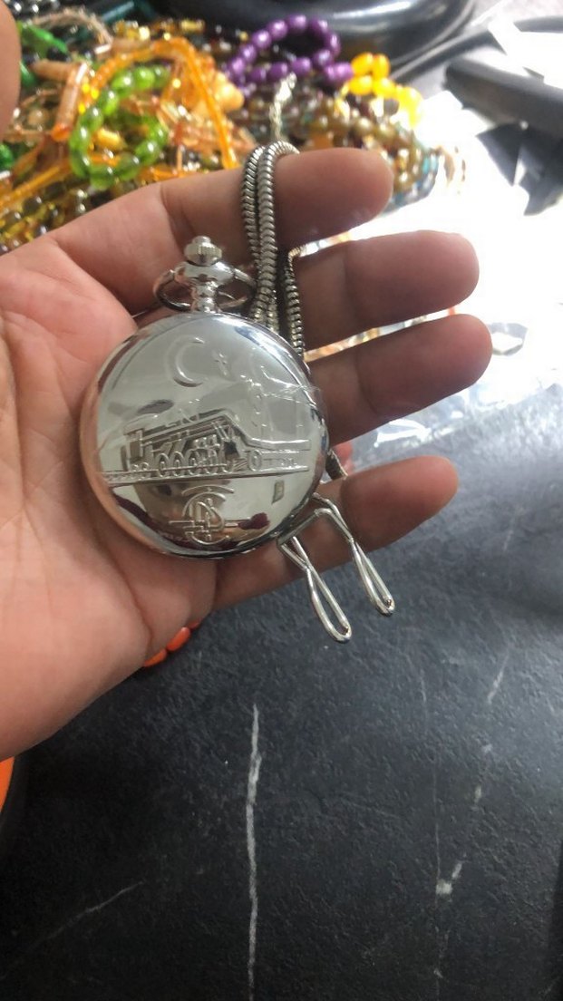 Gri metalik kasalı, kapağında işlemeli erkek cep saati. Zinciriyle birlikte, vintage bir tarz sunar. ⌚