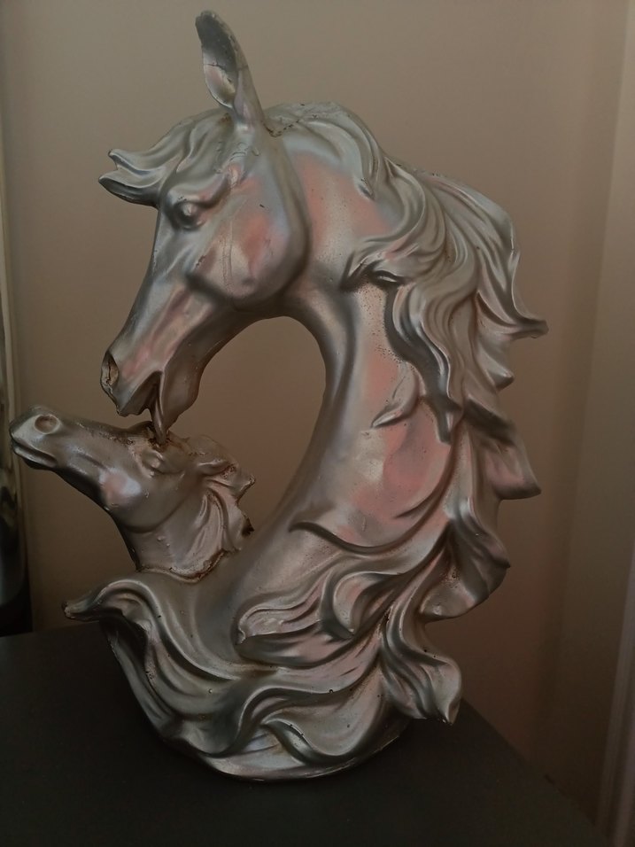 Parlak gri renkte, detaylı ve akıcı saçaklı bir at başı figürüdür. Pürüzsüz ve parlak yüzeye sahiptir. çapı 55 cm yüksekliği 35 cm eni 25 cm dir..sadece kulağında resimde belirttiğim gibi bir kırık meydana gelmiştir oda sağlam yapistiriciyla yapıştırılmıştir fiyat ona göre belirlenmiştir güzel günlerde kullanmanız dileğiyle..