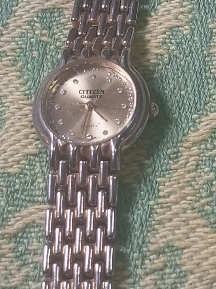 Parlak gri metal kayışlı, düğmeli kapamalı klasik Citizen kadın saati. Yuvarlak kadranda sade nokta işaretler bulunur. ⌚