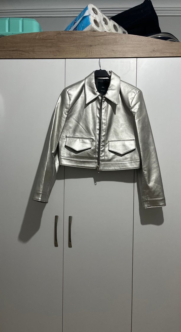 Parlak gri deri ceket, keskin yaka, uzun kollu ve fermuarlı ön tasarıma sahiptir. Normal kesim ve kısa boydadır, İnce vatkaya sahiptir
