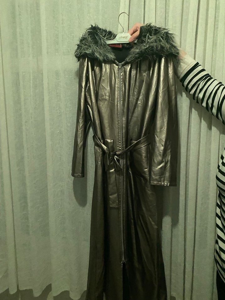 Parlak gri deri, kürklü kapüşon ve kesik yakalı, uzun ve vücuda oturan kadın kabanı, gotik tarzı günlük kullanım için sunar.