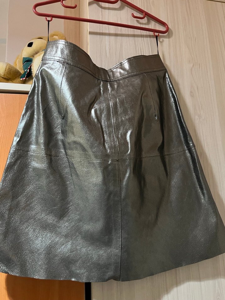 Gri parlak deri, bol kesim midi şort etek,bel ile, gotik tarzda, günlük kullanıma uygun.