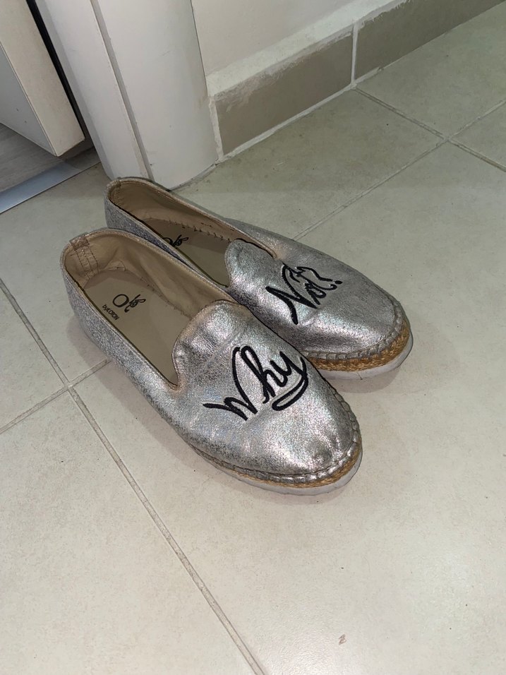 Gri parlak kadın ayakkabısı, nakışlı 'Why' detayı ve günlük sokak giyimine uygun.