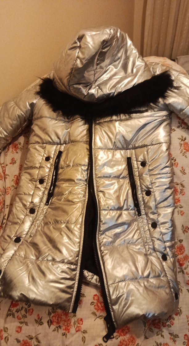 Fitted kesim, midi uzunlukta, gri parlak sentetik kumaştan kadın kışlık mont. Kürk detaylı, yakası kesik ve askılı kollu, düğme aksesuarlarıyla sokak modasına uygun. ❄️