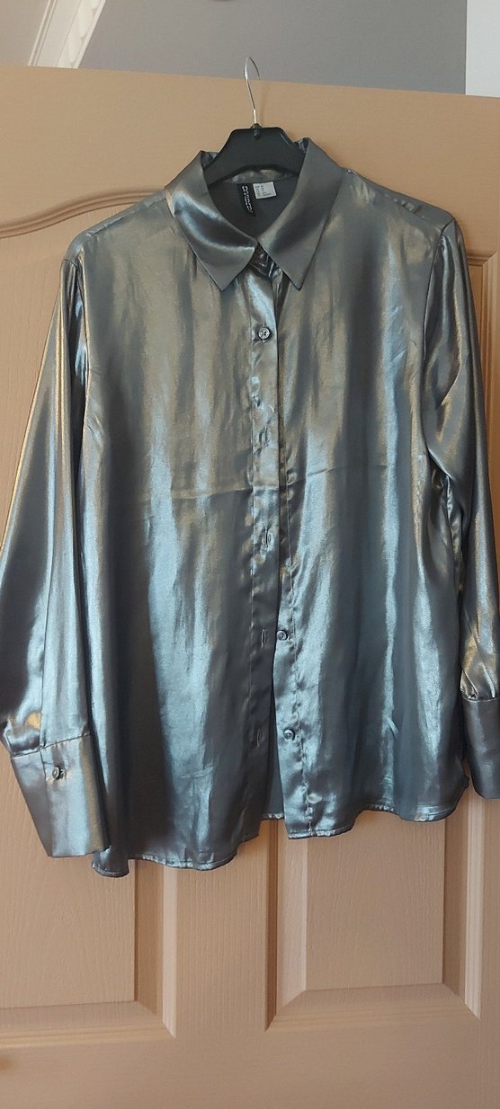 Parlak gri saten kumaştan, uzun kollu ve yakalı, düğmeli, bol kesim kadın gömleği. Ofis kullanımı için uygundur. ✨ XS yazıyor. Fakat S ve M bedene de olur. Geniş kesim.