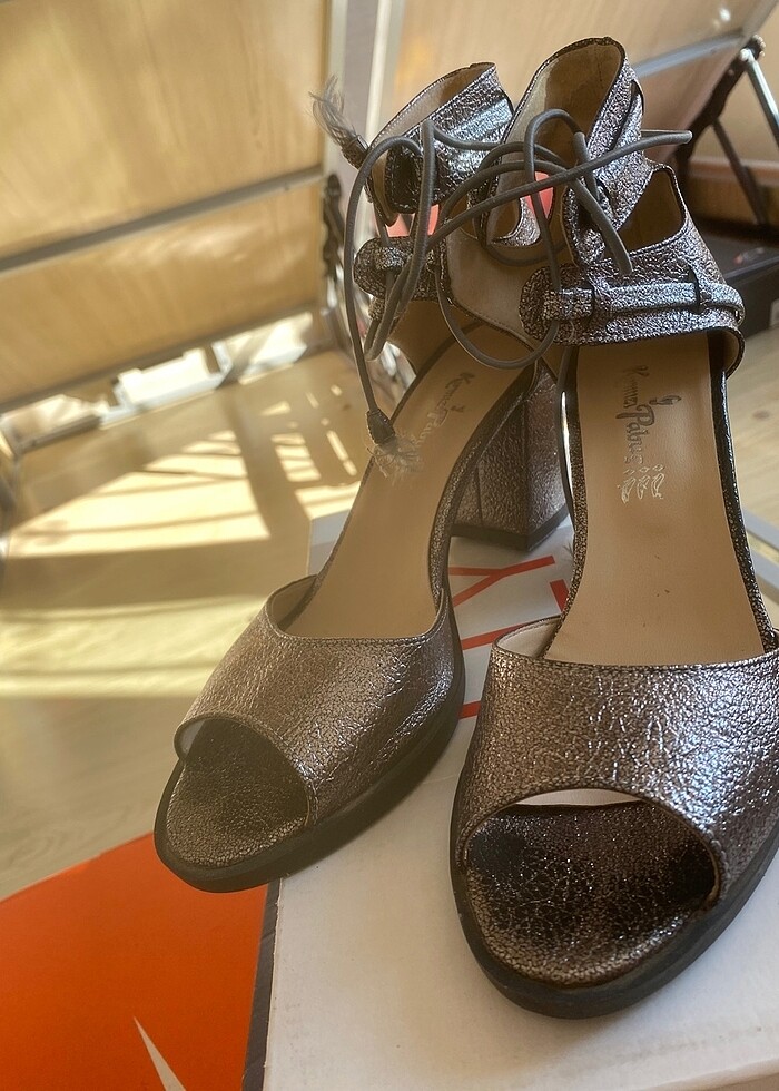 Gri parlak kısa bağcıklı abiye ayakkabı