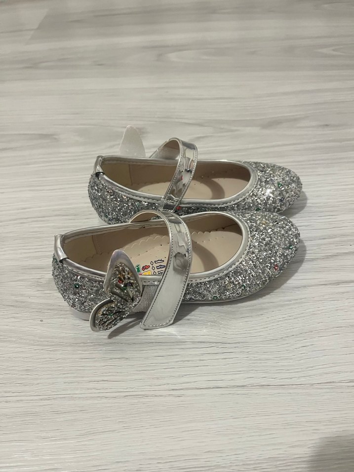 Gri parlak simli yüzeye ve ince yılan derisi desenine sahip kız çocuk babet ayakkabılar. Kauçuk malzemeden üretilmiş, klasik bantlı ve şık tasarımlıdır. ✨