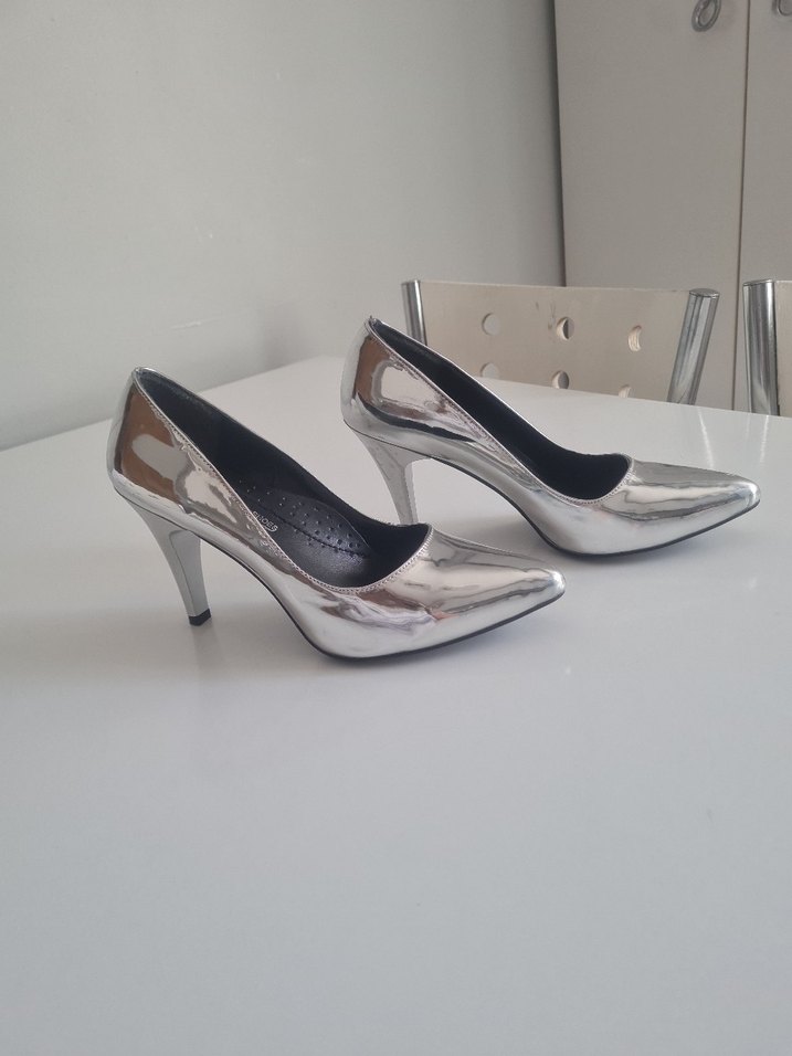 Gri Parlak Metal Stiletto Kadın Topuklu Ayakkabı