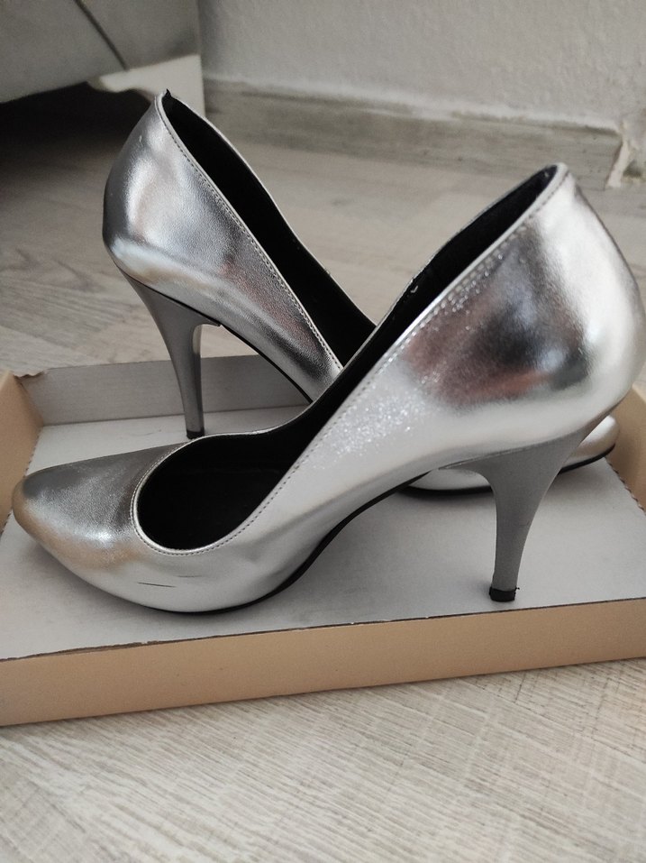 Gri parlak metal görünümlü, klasik zarafet sunan stiletto topuklu kadın ayakkabısı, romantik akşamlar için uygun.