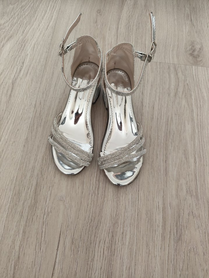 Parlak gri metal yüzeye sahip, tokalı kayışlı dolgu topuklu çocuk abiye ayakkabısı, düğünler için çağdaş bir stil sunar. ✨
