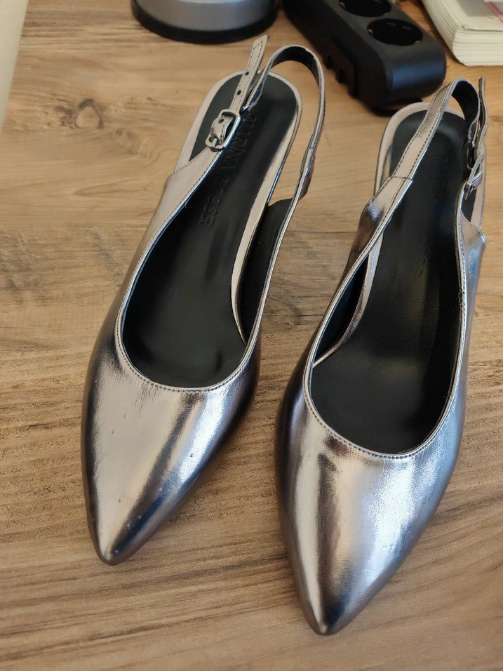 Marina Rosse markadır. Gri parlak metal stiletto topuklu, tokalı kadın ayakkabısı. Klasik ve çağdaş tarzda, desen içermeyen şık bir modeldir.