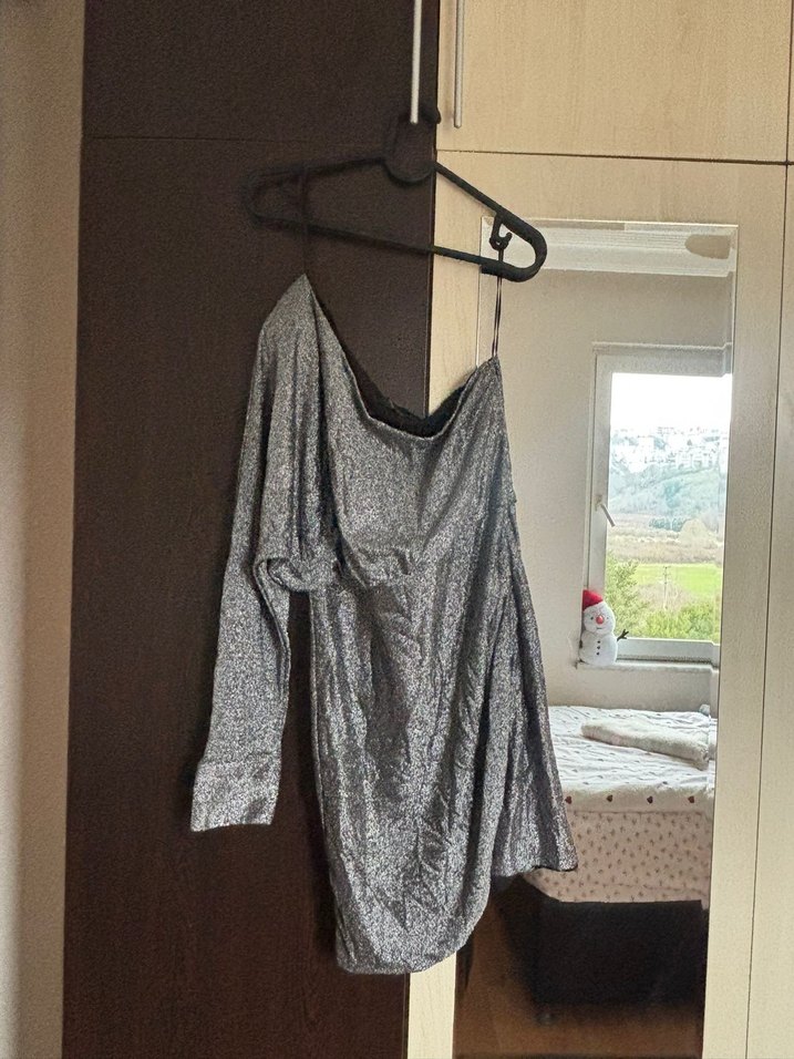 Uzun kollu, askısız, dökümlü tasarıma sahip gri yılan desenli midi elbise. Rahat kesimiyle romantik akşamlar için ideal, modaya uygun bir sokak stili sunar.